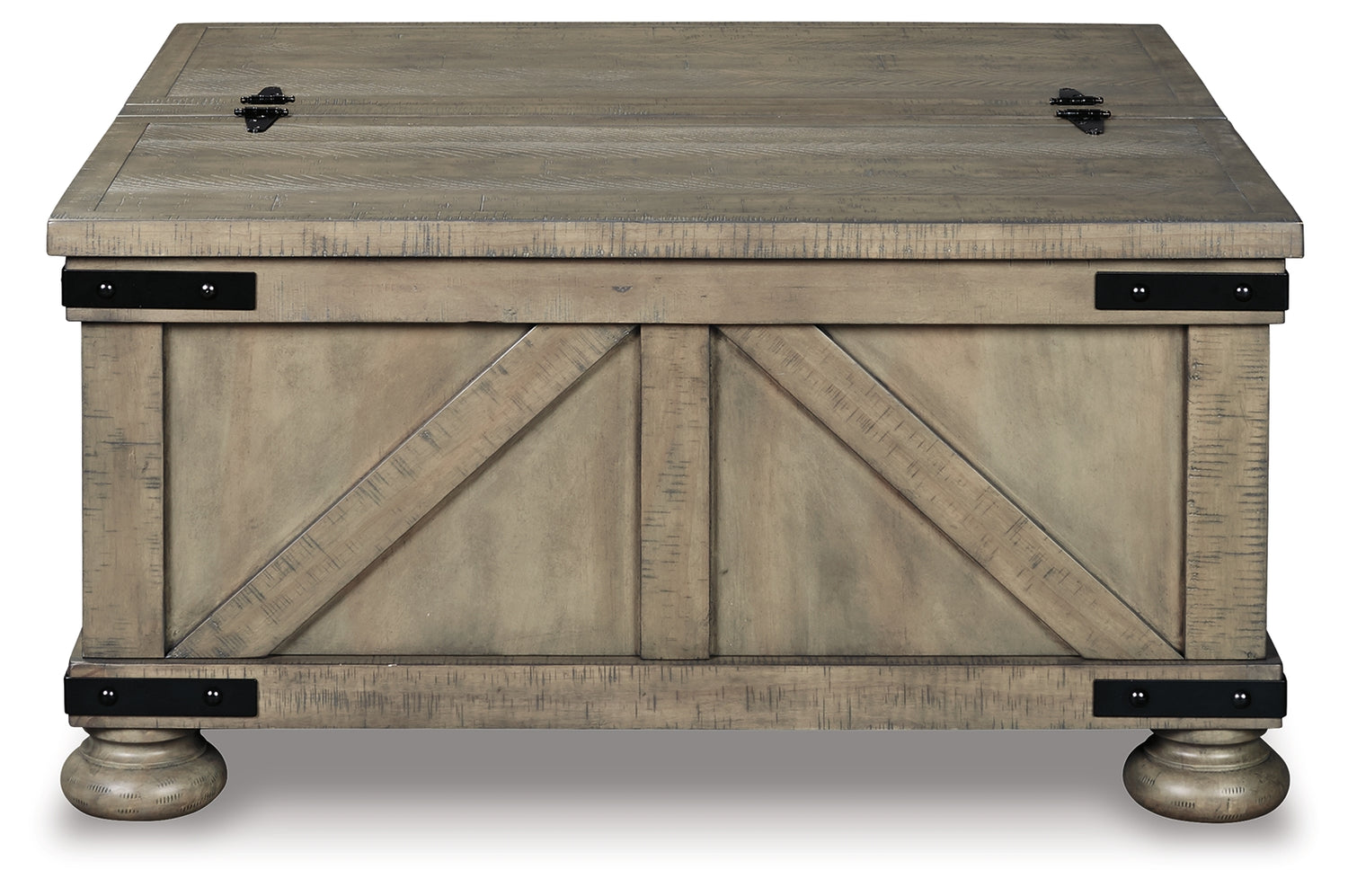 Double up on form and function with this square coffee table with storage. Its dual lid tabletop provides easy access to the roomy storage space. Crafted with solid pine wood treated to a weathered gray finish, this generously scaled coffee table is rustic farmhouse living at its best.